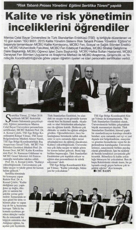 Sertifika Töreni, 22 Mart 2018 tarihinde Rektörlük Senato Salonunda gerçekleştirildi. Eğitimi tamamlayan Üniversitemiz personelinin sertifikaları; Rektörümüz Prof. Dr. A. Kemal Çelebi, TSE Ege Bölge Koordinatörü Kürşat Yılmaz, TSE İzmir Belgelendirme Müdürü Ahmet Namlı, TSE Ege Bölge Koordinatörlüğü Baş Araştırmacı İsmail Ünlü, Üniversitemiz Fen Bilimleri Enstitüsü Müdürü Prof. Dr. Kenan Dost, Üniversitemiz Kalite Koordinatörü Prof. Dr. Ramazan Gökbunar ve Genel Sekreterimiz Ali Emirosmanoğlu tarafından takdim edildi.